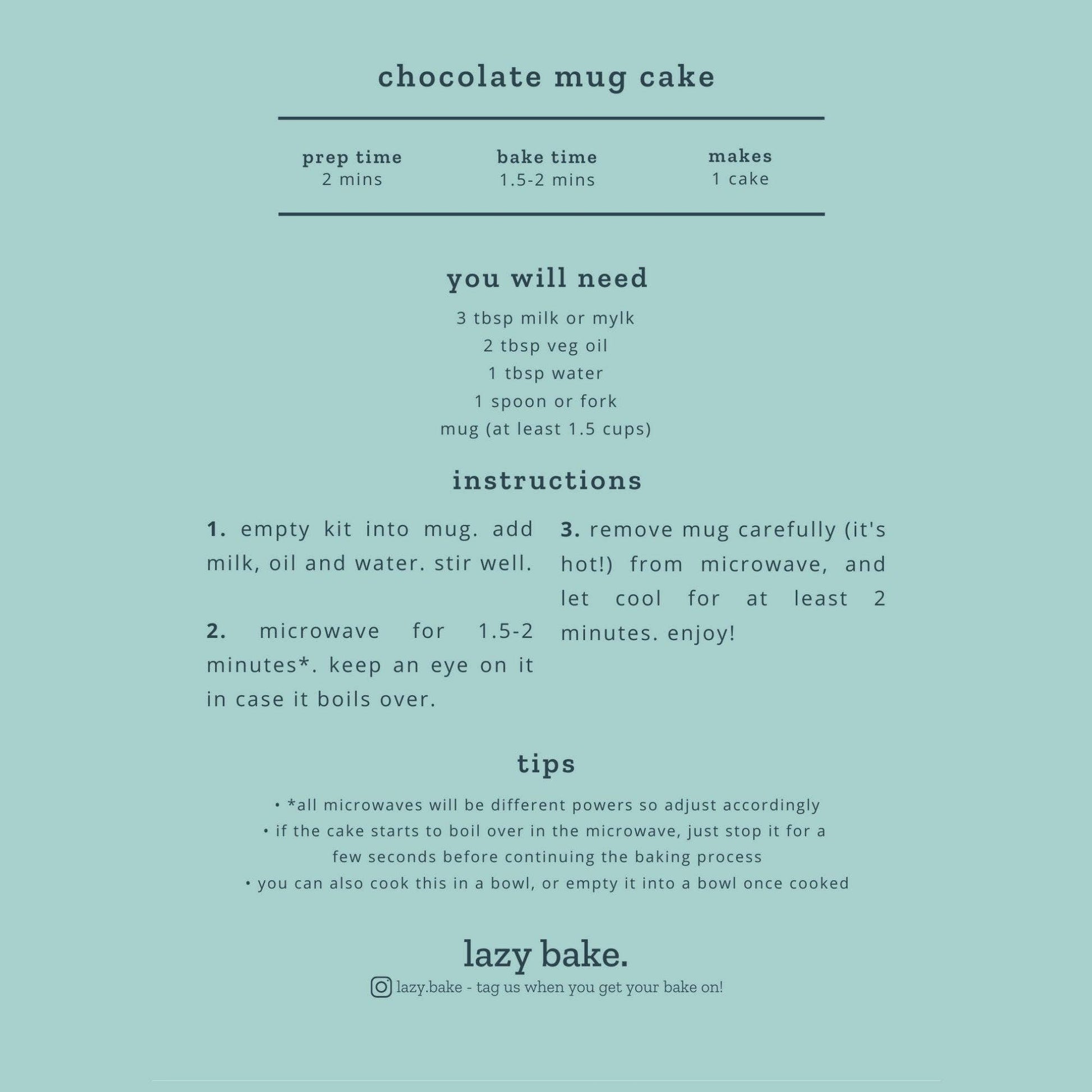 Want even lazier baking? This microwavable, single-serving lazy bake cake makes baking even easier. Add milk, oil and water, then microwave. Best results if you let it cool for a few minutes before diving in, if you can wait. Makes a single serving (if you don't want to share!)
