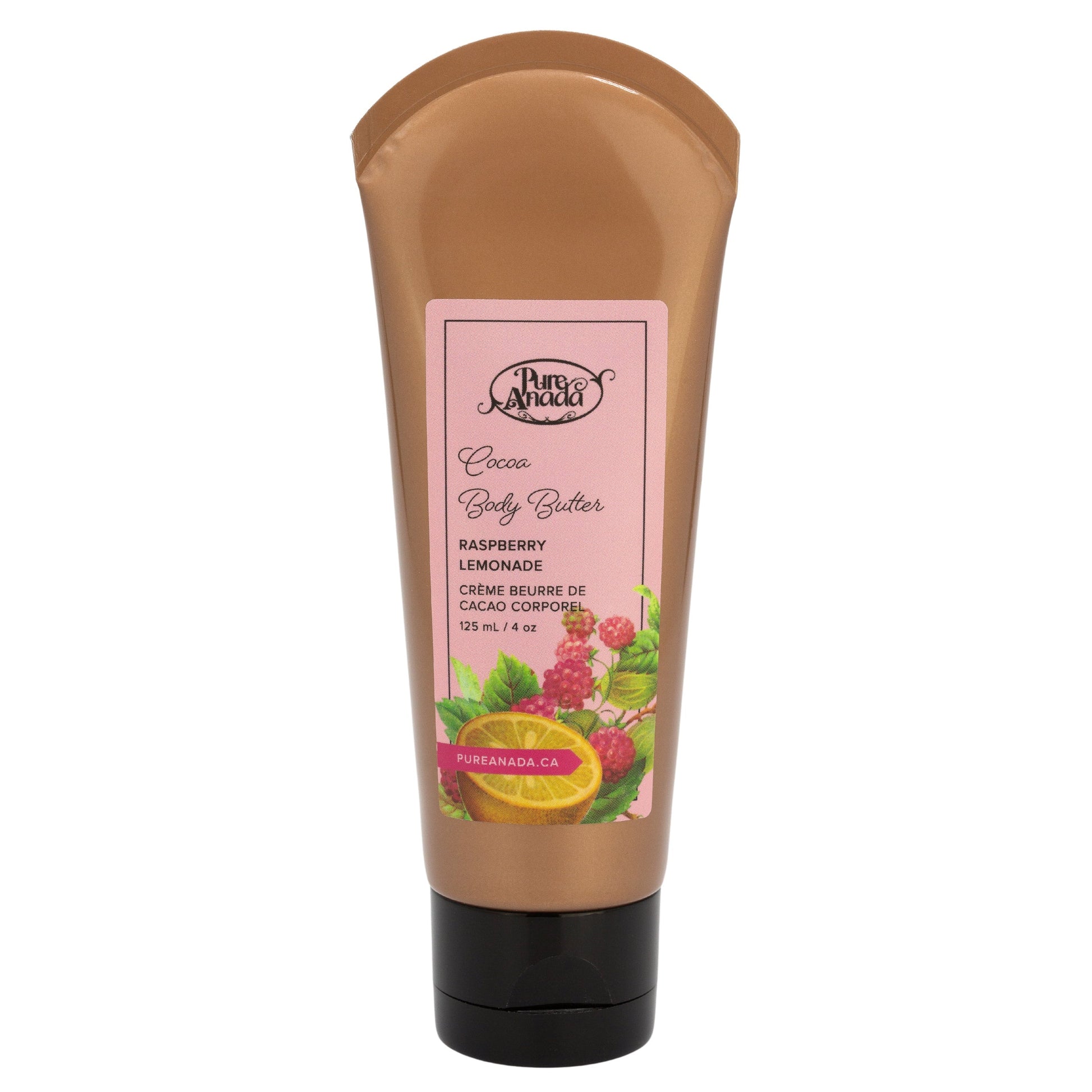 Ingredients: Aqua, Helianthus Annuus (Sunflower) Seed Oil, Butyrospermum Parkii (Shea) Butter, Cetearyl Olivate, Sorbitan Olivate, Vegetable Glycerin, Cetyl Alcohol, Theobroma Cacao (Cocoa) Seed Butter, Leuconostoc/Radish Root Ferment Filtrate & Lactobacillus & Cocos Nucifera (Coconut) Fruit Extract, Xanthan Gum, Aroma (Natural Raspberry and Lemonade Flavours)