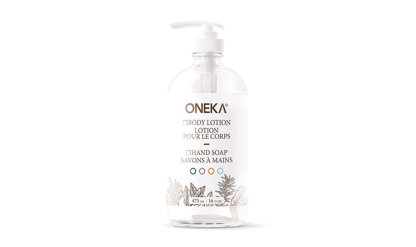 A refillable glass bottle for your Oneka hand soap and body lotion. Refill with your favourite aroma. The generic label lets you pick the product and aroma. Pump included. 475 ml format.