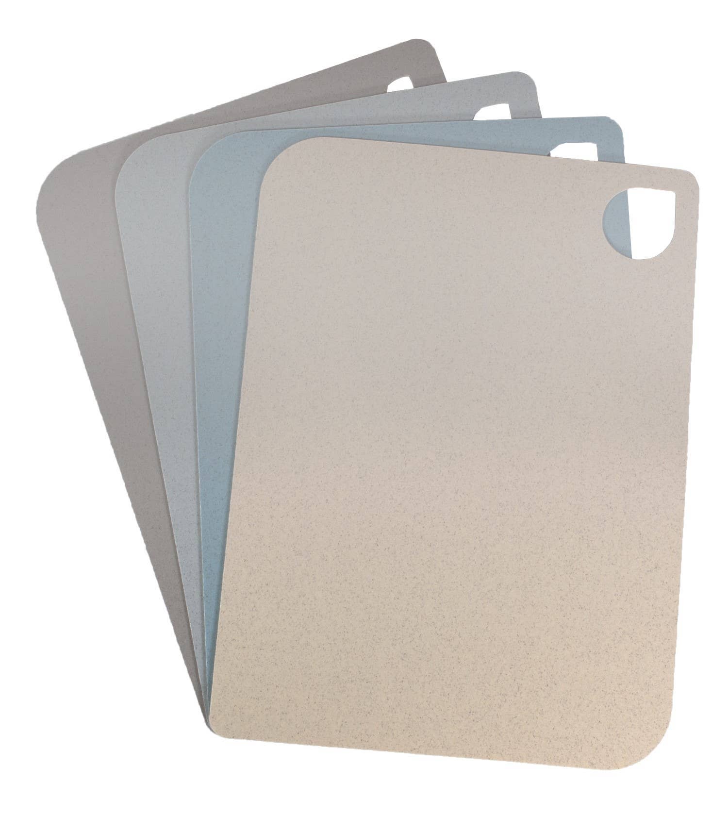 Perfect for color coding for different foods, these kitchen basics cutting mats contain wheat straw for durability. Each mat features a non-slip surface on one side and a flat cutting surface on the other; the cutting surface of the mat will not dull knives. The flexible mats are ideal for everyday use. The set of 4 includes beige, light blue, blue, and grey. Hand washing recommended.