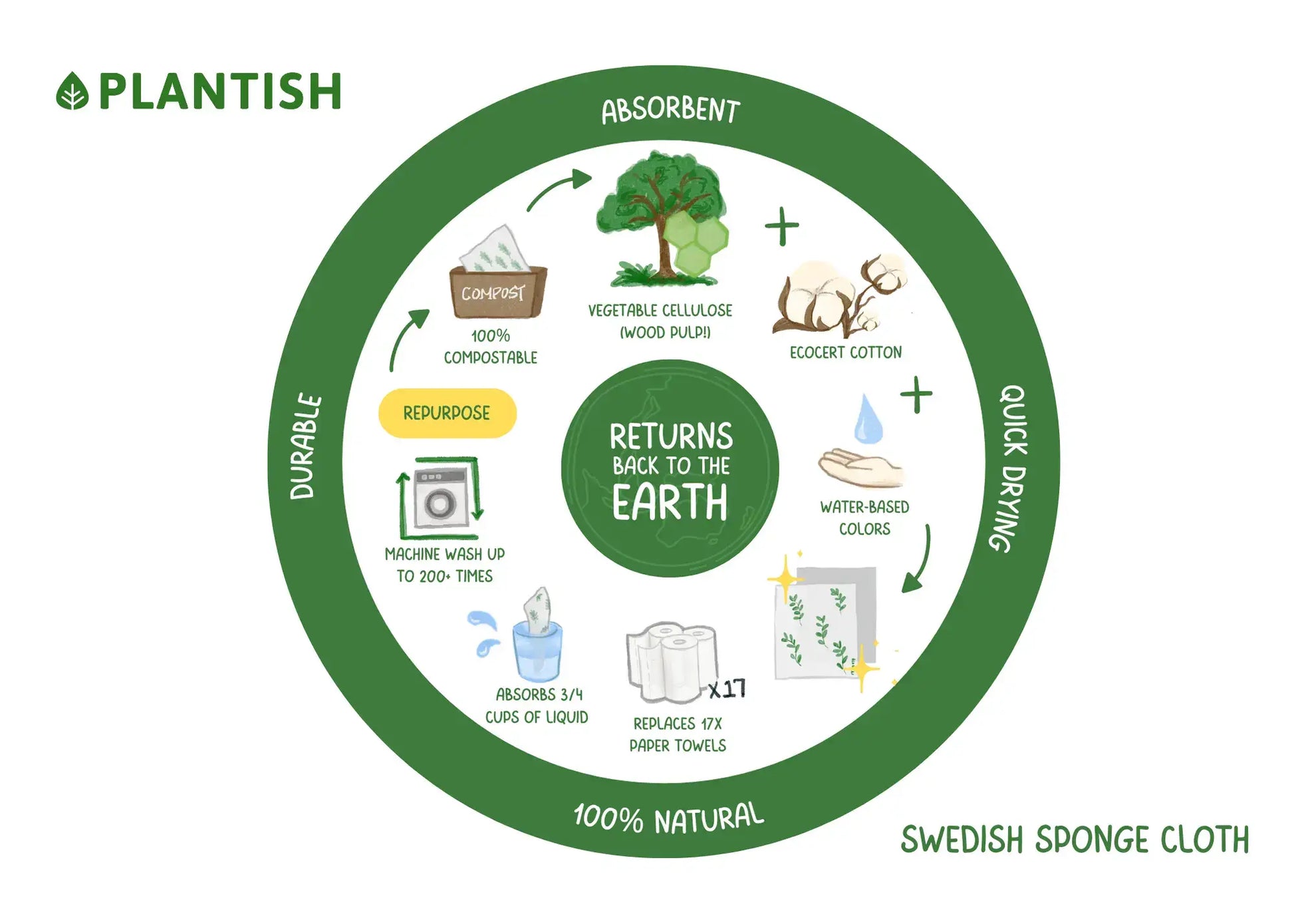 This plant-based sponge cloth can absorb up to 3/4 of a cup of liquids, it's perfect to clean up water and tea spills, dry dishes and pots, as well as wipe countertops and other surfaces.