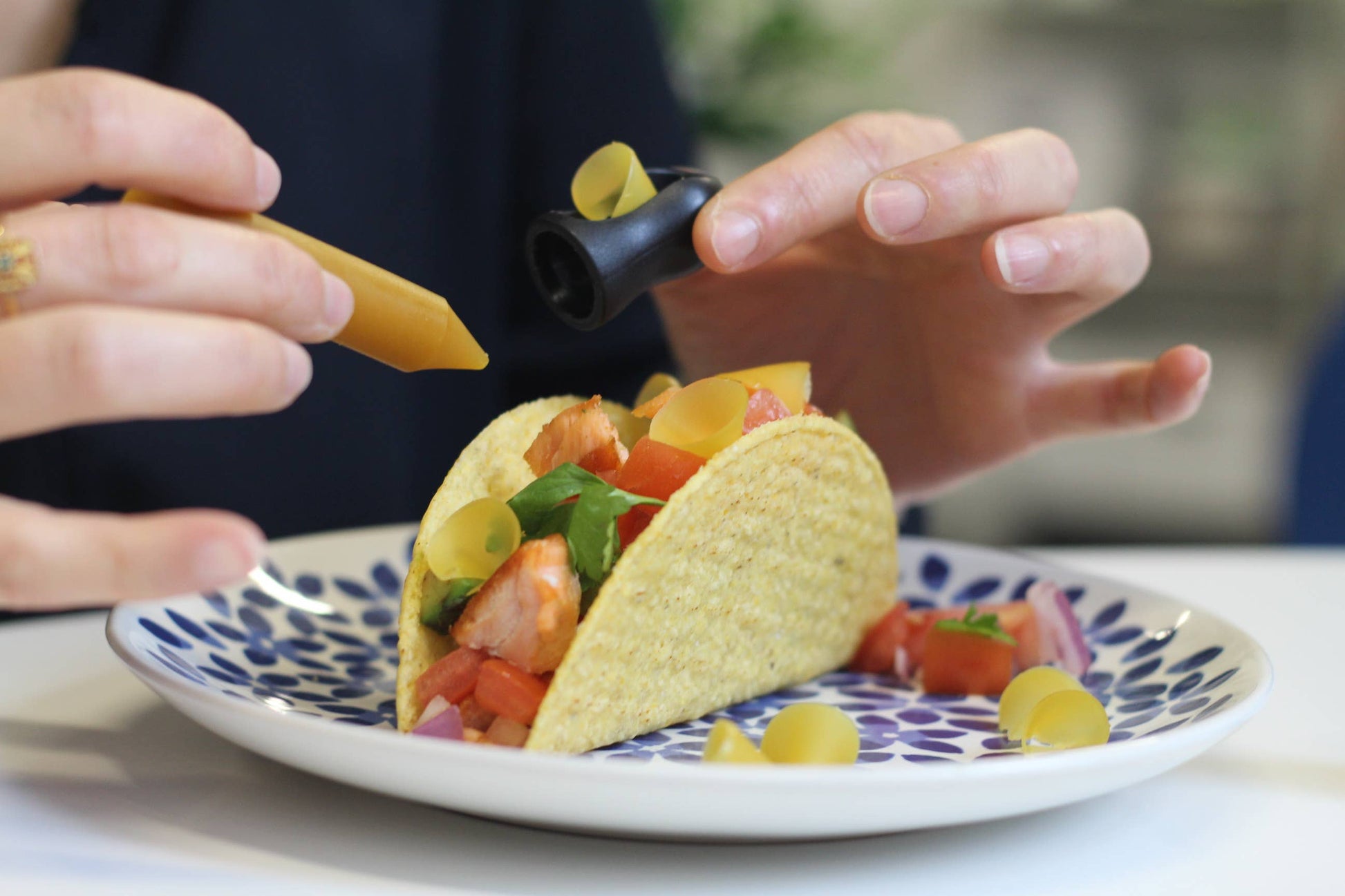 To apply the Food Crayon, you need to sharpen some shavings directly onto your plates, desserts, or drinks as you serve them. The shavings will release the Fig and Balsamic flavor and add a fresh taste to your dishes.