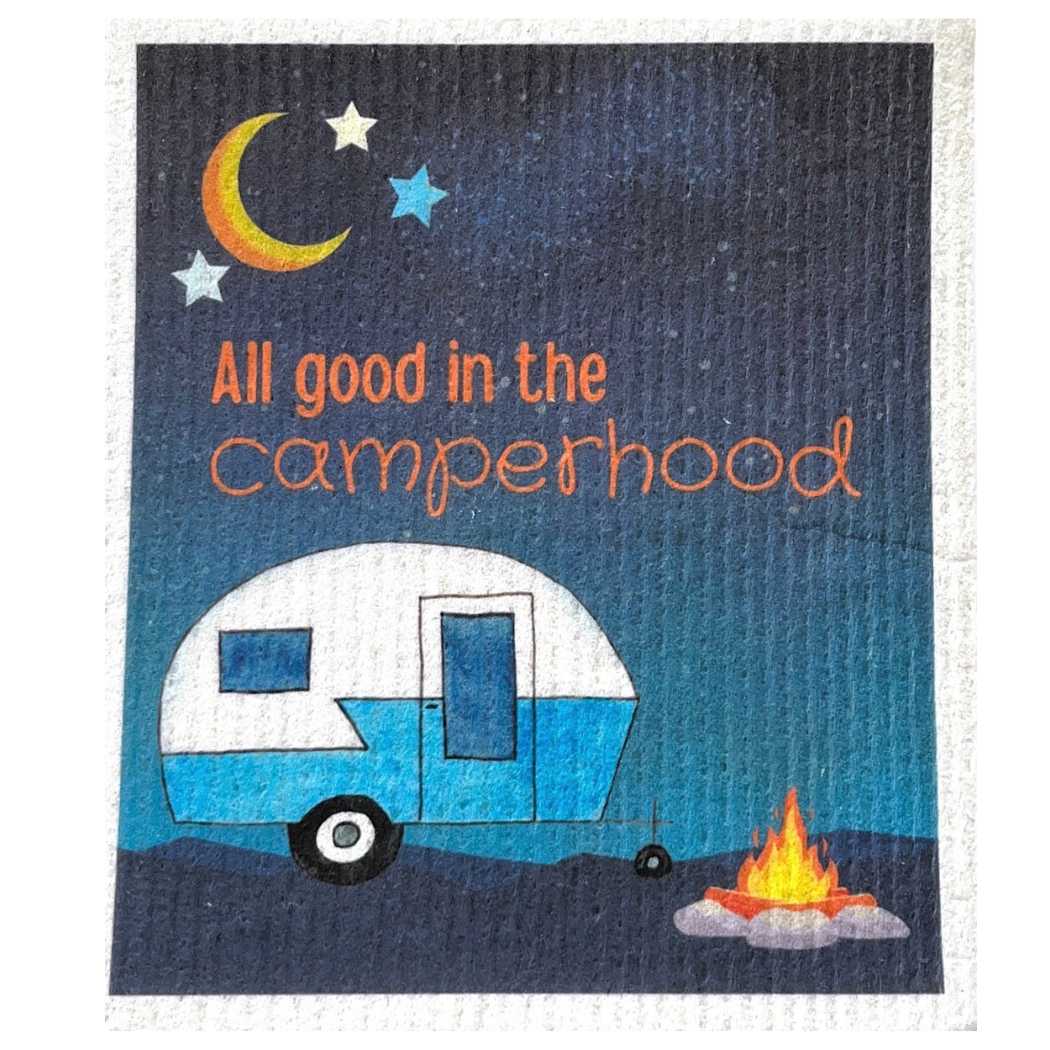 Summer 'All Good in the Camperhood' quote graphic design. This eco dishcloth is a colorful way to wipe up spills and messes in the kitchen! Each Good Kitchen ECO dishcloth is made from 70% cellulose and 30% cotton making it naturally anti-bacterial and 100% compostable.